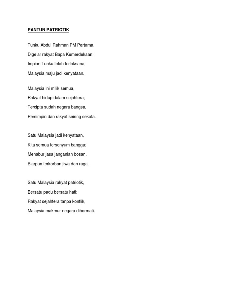 Pantun adalah Satu-satunya karya asli orang Melayu. SAJAK KEMERDEKAAN DEMI NEGARA Aku anak merdeka Lahirku disini Berdiri megah di pentas wira Inginku menentang penjajah Menentang musuh demi Malaysia Aku sanggup berkorban masa Walaupun musuh yang datang Aku tak kan berundur walaupun selangkah kebelakang Aku anak merdeka Bangkit daripada peperangan. SAJAK KEMERDEKAAN KETAATAN DALAM KEMERDEKAAN.