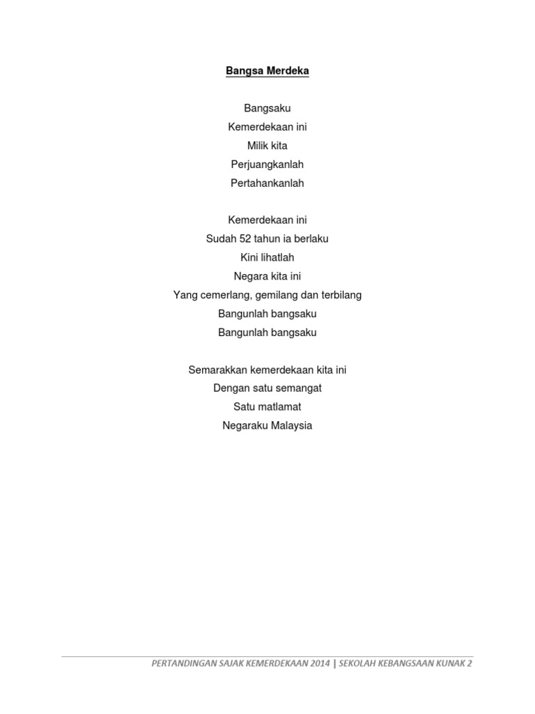Negaraku Bebas Merdeka. Hanya Malaysia negara tercinta. Download View Sajak Sajak Kemerdekaan as PDF for free.
